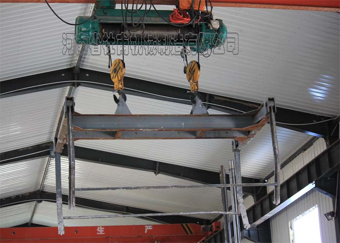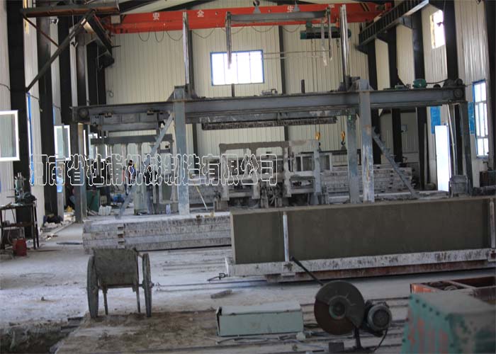 翻轉(zhuǎn)吊具把模具空中翻轉(zhuǎn)90度以后脫模把坯體連同模具側(cè)板放置在切割臺上,縱向切割裝置通過電機帶動自身行走,對放置于切割臺上的坯體進行行走切割,切割完成后行走至暫停位置,橫向切割裝置通過電機帶動自身行走到坯體中央停止后再進行水平式切割,橫切架自上而下垂直降落切割直至上升復(fù)位