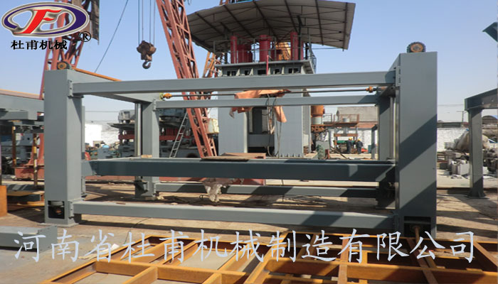 翻轉吊具把模具空中翻轉90度以后脫模把坯體連同模具側板放置在切割臺上,縱向切割裝置通過電機帶動自身行走,對放置于切割臺上的坯體進行行走切割,切割完成后行走至暫停位置,橫向切割裝置通過電機帶動自身行走到坯體中央停止后再進行水平式切割,橫切架自上而下垂直降落切割直至上升復位