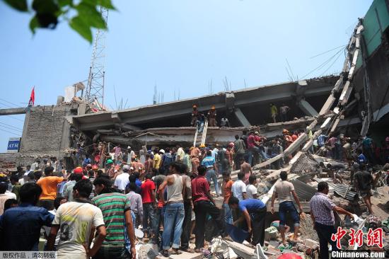 當地時間24日上午9時許,薩瓦爾鎮一棟名為拉納購物中心的八層商用樓房突然倒塌。樓里有數百間商鋪、數家制衣廠和一家銀行。