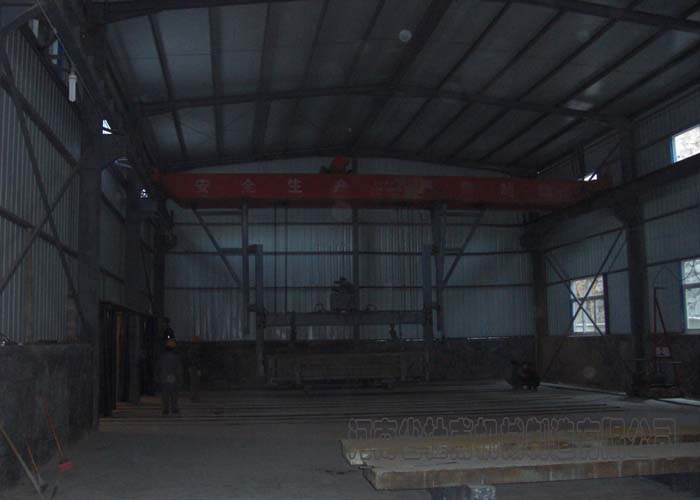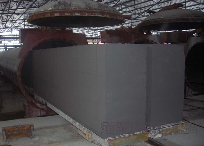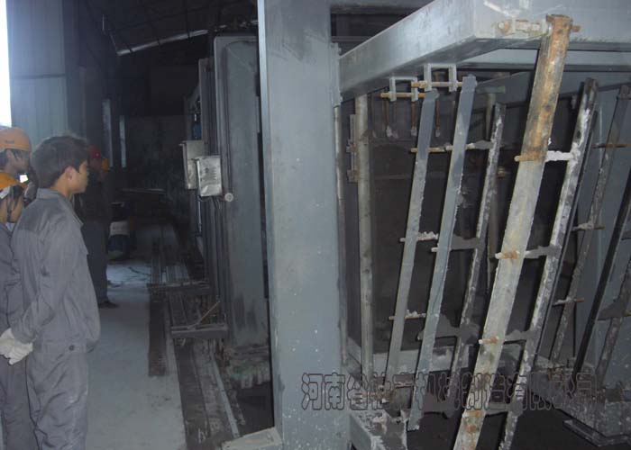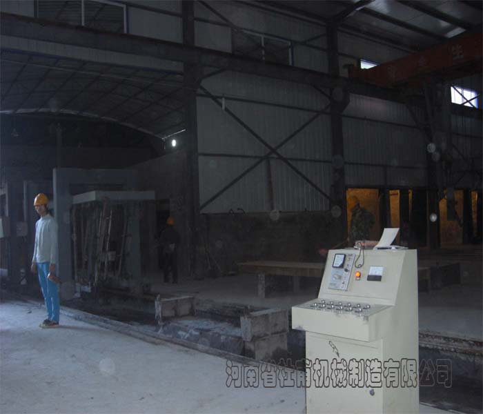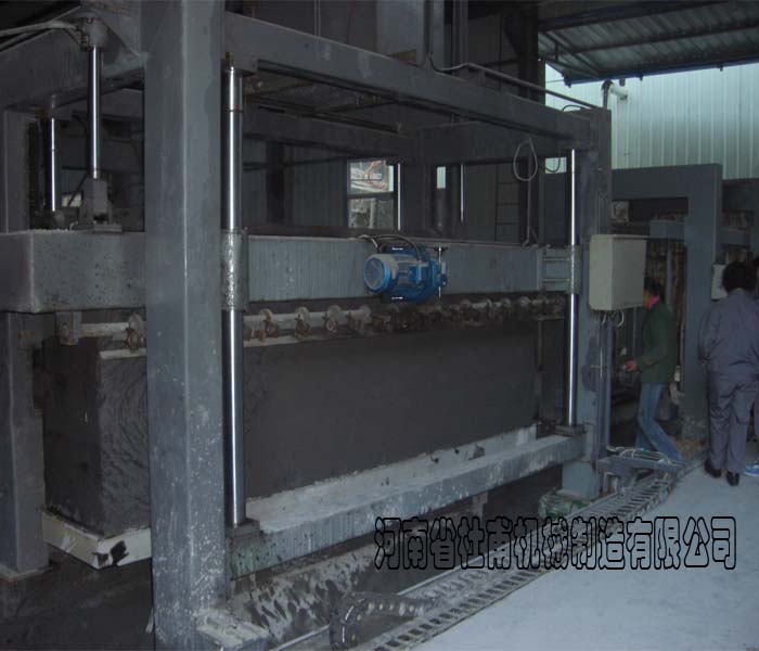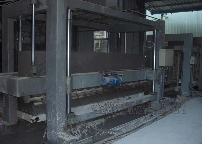 翻轉(zhuǎn)吊具把模具空中翻轉(zhuǎn)90度以后脫模把坯體連同模具側(cè)板放置在切割臺上,縱向切割裝置通過電機帶動自身行走,對放置于切割臺上的坯體進(jìn)行行走切割,切割完成后行走至?xí)和N恢茫瑱M向切割裝置通過電機帶動自身行走到坯體中央停止后再進(jìn)行水平式切割,橫切架自上而下垂直降落切割直至上升復(fù)位