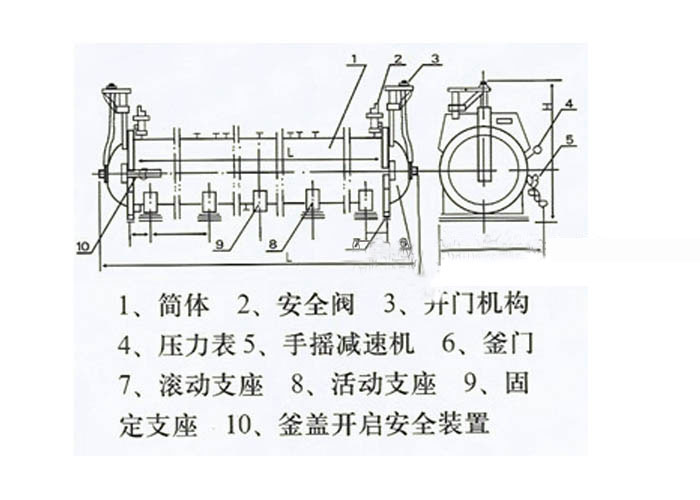 蒸壓釜設(shè)備主體部分主要由釜體裝置、覆蓋裝置、擺動裝置、手搖減速器、安全裝置、支座、保溫層、密封裝置、管道閥門儀表等組成。附屬部分包括排水裝置。 1. 釜體裝置:主要由筒體和釜體法蘭焊接而成。沿法蘭圓周均布嚙合齒與釜蓋法蘭均布的相應(yīng)的齒相嚙合。釜內(nèi)底部鋪設(shè)軌道,可行走或停放蒸養(yǎng)小車。釜體外側(cè)布置各種管座和接管、供進、排蒸汽、排放冷凝水和安裝各種儀表、閥門之用。 2. 釜蓋裝置:主要由釜蓋法蘭、齒板、圓頂封頭焊接而成,通過吊柄和短軸將覆蓋懸吊于相嚙合,起關(guān)閉蒸壓釜的作用。