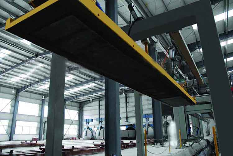 翻轉吊具把模具空中翻轉90度以后脫模把坯體連同模具側板放置在切割臺上,縱向切割裝置通過電機帶動自身行走,對放置于切割臺上的坯體進行行走切割,切割完成后行走至暫停位置,橫向切割裝置通過電機帶動自身行走到坯體中央停止后再進行水平式切割,橫切架自上而下垂直降落切割直至上升復位