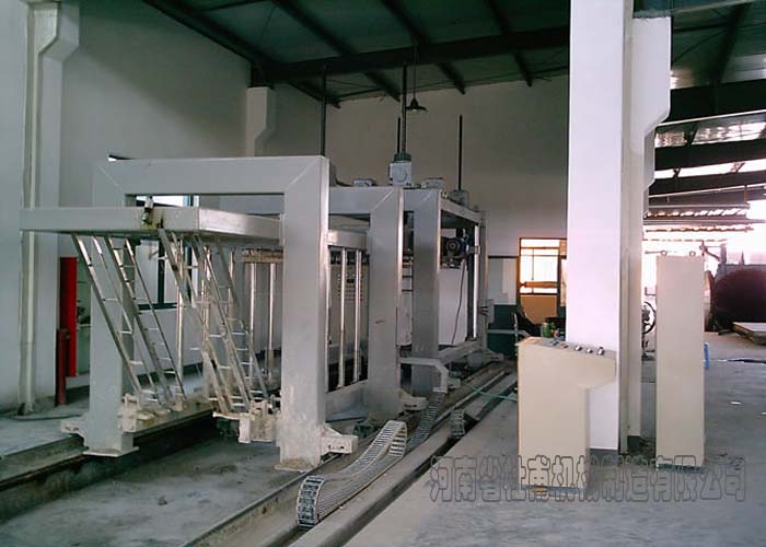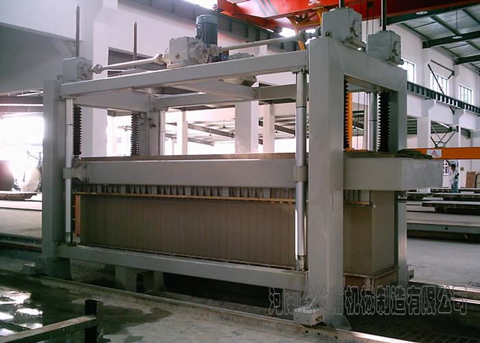 翻轉吊具把模具空中翻轉90度以后脫模把坯體連同模具側板放置在切割臺上,縱向切割裝置通過電機帶動自身行走,對放置于切割臺上的坯體進行行走切割,切割完成后行走至暫停位置,橫向切割裝置通過電機帶動自身行走到坯體中央停止后再進行水平式切割,橫切架自上而下垂直降落切割直至上升復位