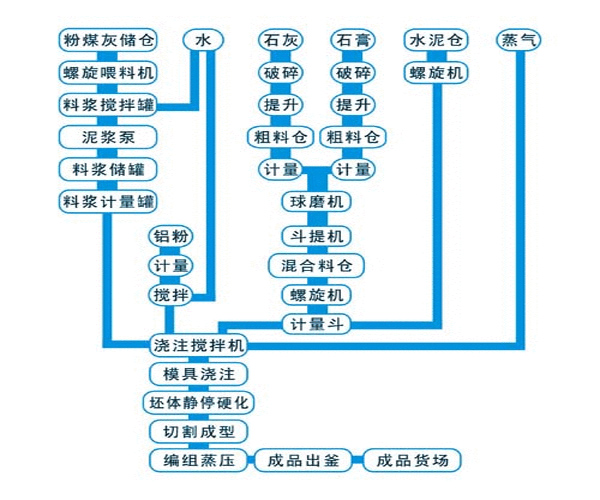 粉煤灰(或砂、石粉)經(jīng)電磁振動(dòng)給料機(jī)、膠帶輸送機(jī)送入球磨機(jī),磨細(xì)后的粉煤灰(或砂、石粉)用粉煤灰泵分別送至料漿罐儲(chǔ)存。 石灰經(jīng)電磁振動(dòng)給料機(jī)、膠帶輸送機(jī)送入顎式破碎機(jī)進(jìn)行破碎,破碎后的石灰經(jīng)斗式提升機(jī)送入石灰儲(chǔ)倉(cāng),然后經(jīng)螺旋輸送機(jī)送入球磨機(jī),磨細(xì)后的物料經(jīng)螺旋輸送機(jī)、斗式提升機(jī)送入粉料配料倉(cāng)中。化學(xué)品按一定比例經(jīng)人工計(jì)量后,制成一定濃度的溶液,送入儲(chǔ)罐內(nèi)儲(chǔ)存。鋁粉由鋁粉庫(kù)運(yùn)至生產(chǎn)車(chē)間,用電葫蘆提升到配料樓二樓倒入攪拌機(jī)中定量加水,攪拌成鋁粉懸浮液
